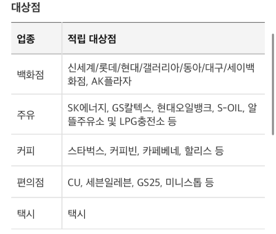 백화점, 주유, 커피, 편의점, 택시 이용금액에선 1000원당 2마일리지가 적립됩니다.