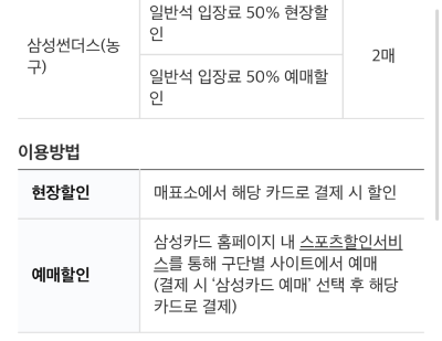 삼성카드 홈페이지 내 스포츠할인서비스를 통해 예매하셔야 합니다.